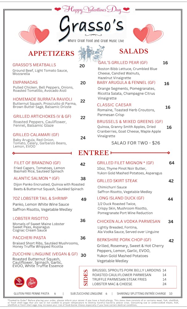 (GF) = Gluten Free *Cooked To Order * Before placing your order, please inform your server if you have a food allergy. If you would like something for dinner that is not on the menu please let your server know and we will gladly prepare it for you if possible. Sharing/Splitting charge $5.00 This menu item consists of or contains meat, fish, shellfish, or fresh shell eggs that are raw or not cooked to the proper temperature to destroy harmful bacteria and/or viruses. Consuming raw or undercooked meats, fish, shellfish or fresh shell eggs may increase your risk of food-borne illness especially if you have certain medical conditions,
